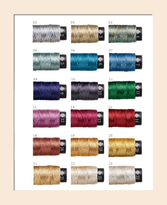 “Nishiki” style is the type often used for Japanese traditional clothing such as Kimonos. This thread has subtle metallic colours and is resistant to friction.  Good for not only stitching but also making tatting lace and highlights in tassels.